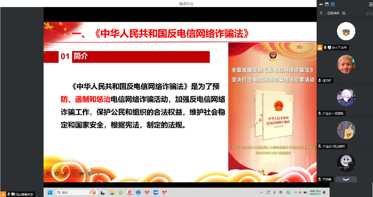 开展普法宣传,以法为教强意识。学院各年级专业深入开展普法教育,辅导员以《反电信诈骗法》为主线,结合“两卡”犯罪、“跑分”洗钱、吸粉引流等违法犯罪行为,通过线上主题班会宣传《反电信诈骗法》,提高大家的反诈法律意识。