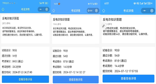 参与知识竞答,以赛促防强素质。学院各年级专业广泛动员同学们关注“平安安建大”微信公众号,参与反电诈知识答题活动,通过答题测试自己的反电诈知识储备,进一步提高同学们的反电诈能力。