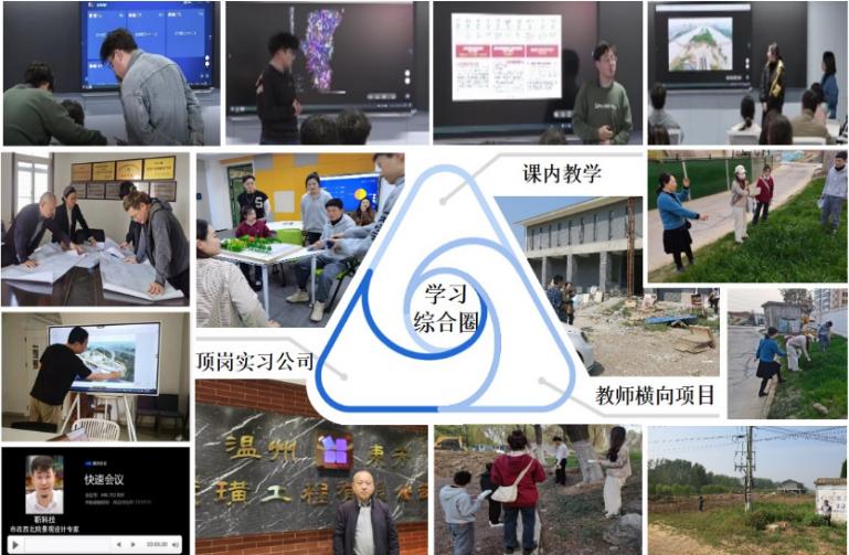 守本创新、跨界融合,培养学生高阶思维能力。课堂以学生项目汇报为主要形式通过翻转课堂提高学生课堂活动的参与度,促使学生思考突发水文事件背景下环境设计理念的功能性、适宜性。课外,利用教师横向科研实习基地等拓展学生的理论运用实践的广度和深度。从而构建“学习综合圈”,培养跨专业知识综合运用高阶思维“三课堂”联动思政育人,激发学习热情。利用课堂教学主渠道,采用情境创设、社会环境保护和破坏等热点问题,发起学生讨论、辩论,把中国特色社会主义生态观、可持续发展等理论融入课堂,引领学生崇敬大国工匠精神,提高学习动力的问题。以社会实践课堂为战场,通过邀请专家、专业竞赛、实践项目等,引领学生担当公园城市建设大任,端正学习态度。以实践基地课堂为阵地,通过定向任务、考察实习、传帮带等,引领学生培养复合型人才,激发学习热情。