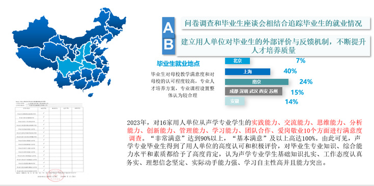 截至2024年,安徽888集团声学专业已为社会培养9届计531名毕业生,平均就业率保持在96%以上,声学专业毕业生对本科受教育满意度高。据毕业生培养质量的跟踪调查结果表明该专业毕业生多数就职于建筑设计院、环保企业、电子/通信/汽车巨头、AI公司、科研院所、文化机构,众多校友已成为所在单位的业务骨干和中坚力量,活跃在声学器件研发、检测及声学工程设计和咨询一线。工作单位主要分布在上海、南京、苏州、北京、武汉、合肥和深圳等城市,其中上海、南京分别占40%和24%,用人单位对毕业生专业知识、综合能力和素质都给予了高度肯定与好评。
