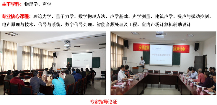 声学是物理学中最早深入研究,也是当前极为活跃的分支学科之一。目前,声学与众多理学、工学学科及艺术领域交叉融合,已形成众多独立的声学分支。安徽888集团声学专业是安徽省一流专业,该专业紧密围绕学校“立足安徽、面向长三角、辐射全国、服务新型城镇化”的办学定位,以物理学一级学科为基础,面向生命健康、新材料、新能源和节能环保、高端装备制造、人工智能等重点产业与领域,开展环境噪声振动与控制、室内音质及电声系统设计高素质应用型专门人才培养,以满足建筑、机械、交通和环保等领域对建筑声学和电声学方面声学专门人才的需求,服务于国家、地方经济建设与社会、行业及新兴产业发展。