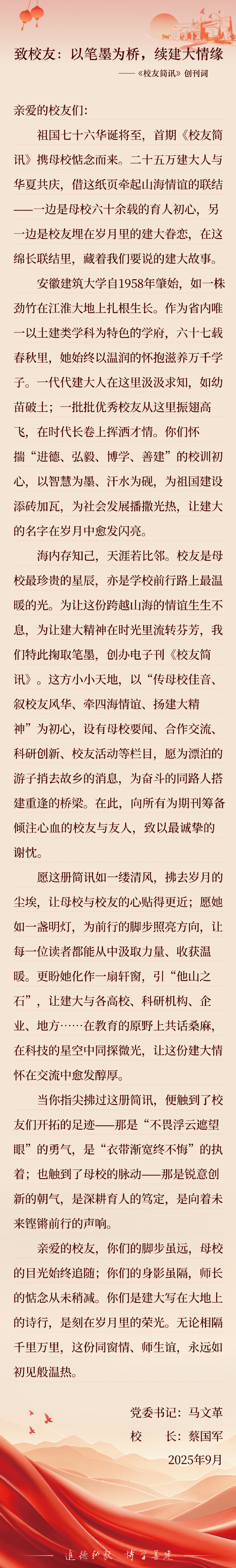 校友简讯,源于母校对校友的深情惦念,更旨在构建一个“信息互通、情感互联、发展互促”的精神家园。简讯设有“母校要闻、合作交流、产学研用、莘莘学子、校友之窗”栏目。其中“母校要闻”着眼于建大在高质量发展道路上的坚实步履;“合作交流”展现着母校开放办学的广阔格局;“产学研用”聚焦建大人服务国家战略的责任担当;“莘莘学子”见证后辈传承建大精神的蓬勃朝气;“校友之窗”则搭建了专属于建大人的风采舞台。我们同样诚挚期盼全体校友提笔供稿,让每份牵挂都化作联结彼此的情感纽带。