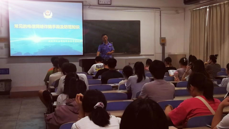常青派出所所长孙传洋警官、辖区民警李祥警官就常见的电信网络诈骗手段及防范知识、禁毒防艾等内容对学生进行专题教育,通过详实的案例分析、深入的思想剖析、专业的数据解读,提高学生防范电信诈骗、拒绝毒品保护自我的能力。