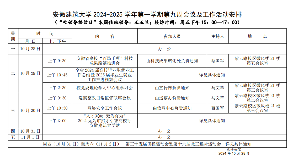 安徽888集团 2024-2025 学年第一学期第九周会议及工作活动安排
