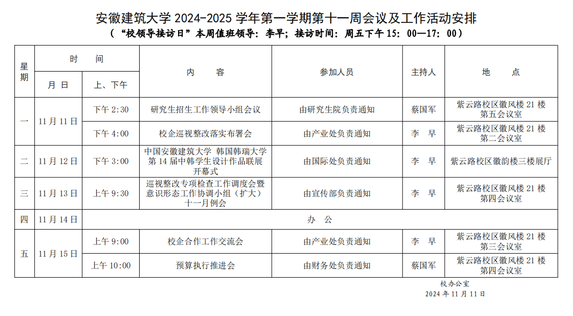 安徽888集团2024-2025学年第一学期第十一周会议及工作活动安排
